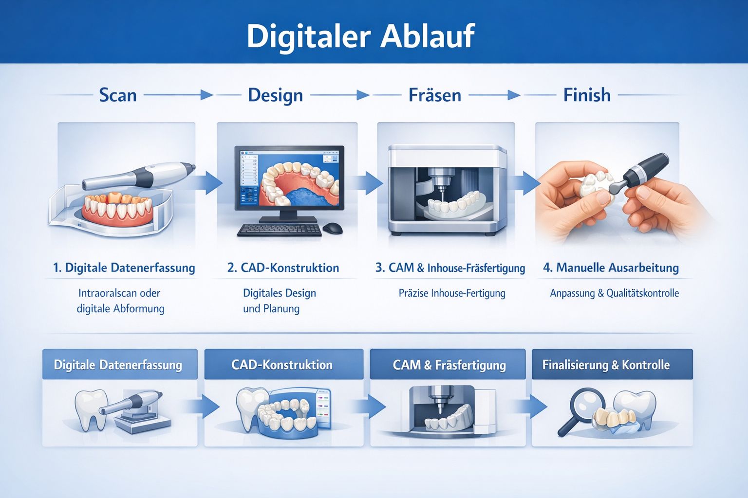 Unser vollständig digitaler Workflow ermöglicht eine nahtlose Zusammenarbeit zwischen Praxis und Labor – von der intraoralen Datenerfassung bis zur finalen Restauration. Digitale Scans werden direkt in präzise CAD/CAM-Prozesse integriert, wodurch reproduzierbare Ergebnisse und eine effiziente Kommunikation gewährleistet sind.